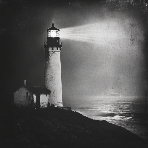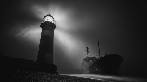 Ultra realistic photography, texture detail, film noise, black and white photography, all black and white night, lighthouse on the beach, close-up, lights coming straight from the lighthouse, cinematic lighting, cinematic composition,