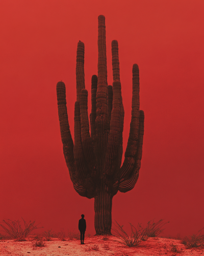 A man standing below a giant cactus, the cactus have a lot of arms, in the desert, by Tim Walker and Yoshitomo Nara, red background, minimalism, hyperrealistic, cinematic, photographed from distance, motion blurred, grainy film noir style, red filter, low contrast, ultra realistic, black shadow figure, vintage, dark red background, blurry, glitched photo, --ar 51:64