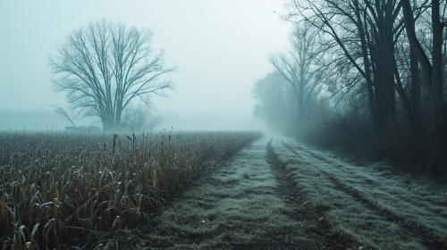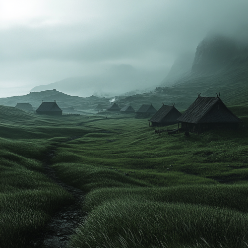 a greenish grey grassland in a dark fantasy cinematic 3d image it is a beautiful yet drab landscape and is barely populated with huts some of the pictures have no huts
