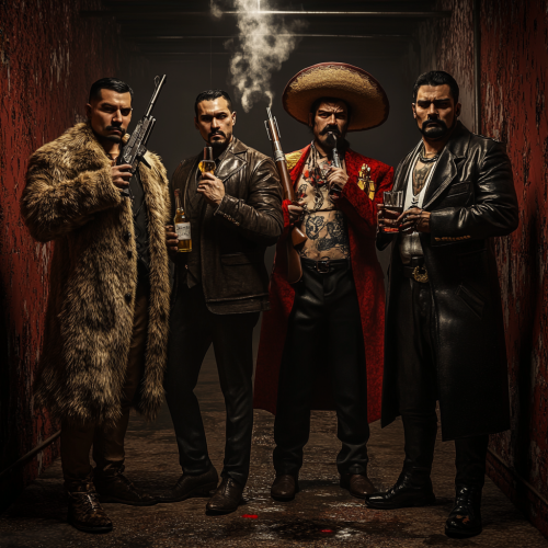A powerful and cinematic image featuring four distinct mafia members standing together in a unified yet tense formation. The first is a Russian mafia member in a heavy fur coat, holding a bottle of vodka and a pistol. Next to him, a Mexican cartel member with a sombrero, wearing a leather jacket and holding a bottle of tequila with a rifle slung over his shoulder. The third figure is an Italian mafia boss in a sleek, tailored suit, puffing on a cigar with a revolver in hand. The fourth is a Yakuza member, dressed in a traditional kimono, showcasing full-body tattoos and holding a katana. They stand in an urban setting that combines elements from Russia, Mexico, Italy, and Japan, each representing their culture with subtle background details. The image should capture the essence and uniqueness of each mafia style, with a focus on all four figures clearly visible.