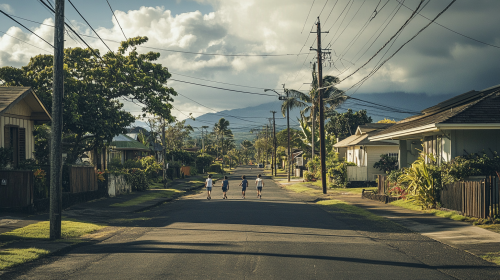 photo of a street view of a neighborhood on the big island of hawaii, with kids walking home from school. dramatic perspective and lighting, cinematic --ar 16:9