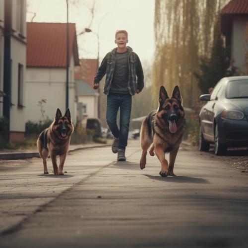 a man in his forties, dressed casually, a happy child jumping in the street, a German shepherd dog. The three of them walking on a sidewalk in the suburbs, cinematic --v 5.0