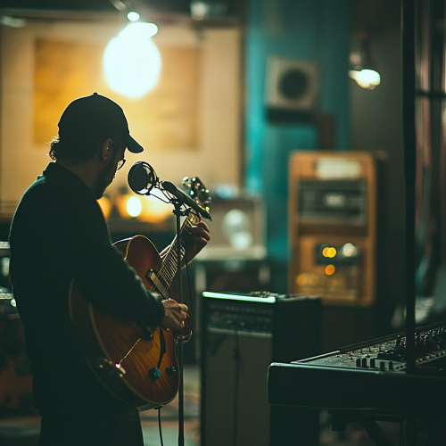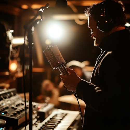 musican working in a studio session with microphone, realistic photographic, 35 mm lense cinematic style shot in the style of Roger Deakins Cinematography, the studio room should be light similar to From the Basement live music show by Nigel Godrich