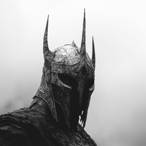 Sauron helmet, from the lord of the rings, fog ambience, cinematic light, minimalist close perspective, photorealism, unreal engine 5 render, very detailed, 4k, black and white, white background