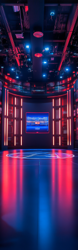 a background sports or football theme tech talk show space, center, wide shot, warm & cold lighting, cinematic, dynamic color --v 6.1 --ar 6:19 --s 250