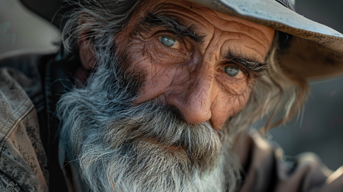 a cinematic mid close up shot of a man in his 60's, prospector from the old west, cowboy hat, large grey beard, hyper realistic, shot on fuji xt3, --ar 16:9 --v 6.0