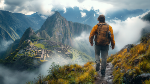 Setting: Camino hacia las ruinas de Machu Picchu, por la tarde. Personajes que intervienen: El protagonista, lugareños. Character Description: Protagonista: Determinado y lleno de anticipación, listo para enfrentar el desafío final de su viaje. Lugareños: Misteriosos y reservados, guardianes de los secretos del lugar. Cinematic Shot: Un plano largo del protagonista caminando por el sendero empinado, con la majestuosa montaña de Machu Picchu al fondo. La cámara se mueve a su alrededor mientras saluda a los lugareños que lo observan con curiosidad y desconfianza. Un plano cercano muestra su rostro cubierto de sudor, pero resuelto, mientras avanza hacia su destino. La escena culmina con una toma aérea del protagonista alcanzando un punto elevado, mirando hacia las ruinas con un sentido de logro y reverencia. Location: Camino hacia Machu Picchu, Perú. Era: 2000. ultra realistic photography 64K resolution,extreme high detail. --style raw --s 750 --ar 16:9 --v 6.1