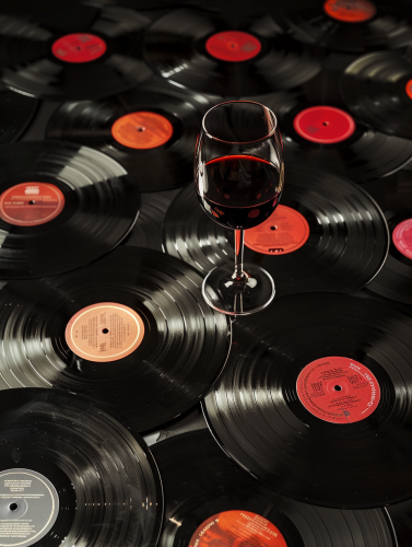 wine glass surrounded by vinyl records, studio light environment, black color environment, dark golden flashes light environment, ultra realistic, high definition, real details, 8k, cinematic, color grading, real photo, cinematic, color grading, real photo, This photo was taken using Fujifilm Superia X-TRA 400 film. shot on a film camera, grainy, high contrast, Kodak colors, The photography is in the style of Architectural Digest. in the 80s decor magazine style, 8K. --ar 3:4 --v 6.0 --style raw