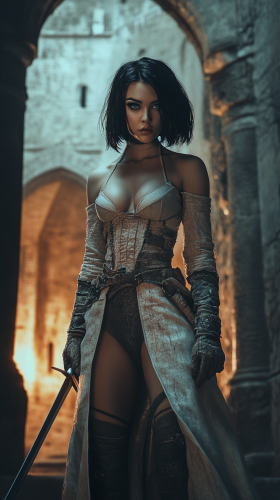 realistic photo. full body length. beautiful young woman. Conan outfit. Feral outfit. Short black hair. Blue eyes. Lithe form. Fortress background. Cinematic, 35mm lens, global illumination, uplight. --ar 9:16 --v 6.1
