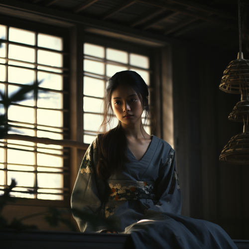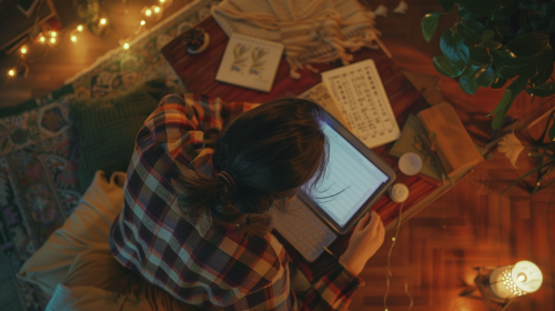 cinematic scene, young woman writes japanese, top view extreme close up, background of interior room, style of a mock up, warm colors, cinematic lights, 4k --ar 16:9 --v 6.0 --style raw --s 50