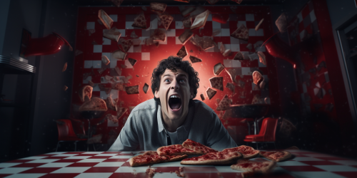 a realistic cinematic-style wallpaper artwork with large stylized artistic red and white checkers blending throughout the image. a person eating a pizza slice. close up and having a great time. Cinematic dark dramatic lighting. artistic splashes throughout the image in front of the red and white checkers --ar 2:1