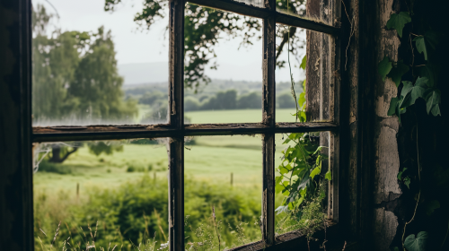 Cinematic, Photo, classic window with green field view, wide shot, captured by Hassellad X1D --ar 16:9 --style raw --v 6.0