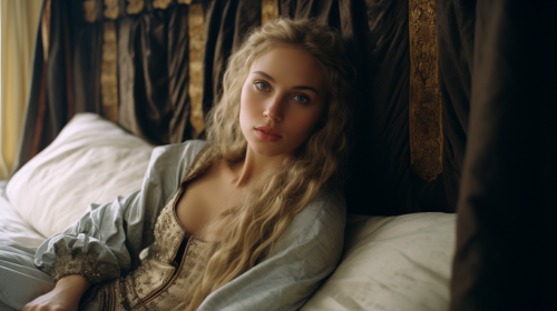 Cinematic, Documentary photography, daenerys targaryen on a bed looking regal, wet, ARRIFLEX 35 BL Camera, Canon K35 Prime Lenses, 70mm --ar 16:9 --style raw