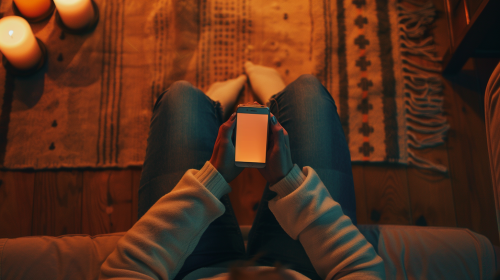 cinematic scene, young woman hands with a phone, top view extreme close up, background of interior room, style of a mock up, warm colors, cinematic lights, 4k --ar 16:9 --v 6.0 --style raw --s 50