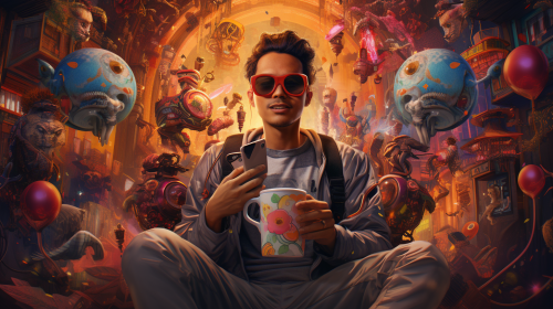 a photorealistic image of a male hip boba tea drinker selfie as digital art with elements of psychedelic imagery and cosmic ambiance. --ar 16:9