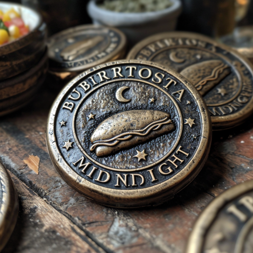 round brass medallion showing a burrito and a moon and the text "BURRITOS AT MIDNIGHT" --v 6.0 --s 750