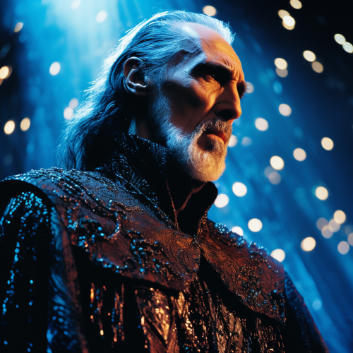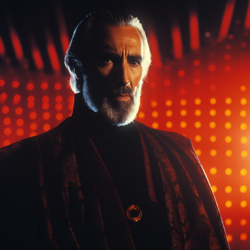 close-up of Christopher Lee as Count Dooku in lower third of the image, 1999 movie, highly detailed beautiful face, highly saturated colors, intense colrful side lighting, dramatic cinematic lighting, psychedelic set design, saturated colored lights