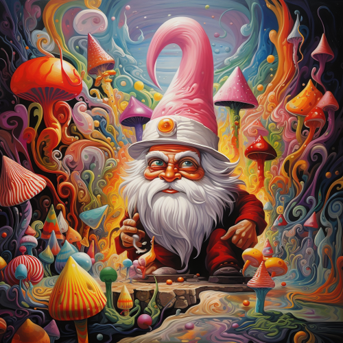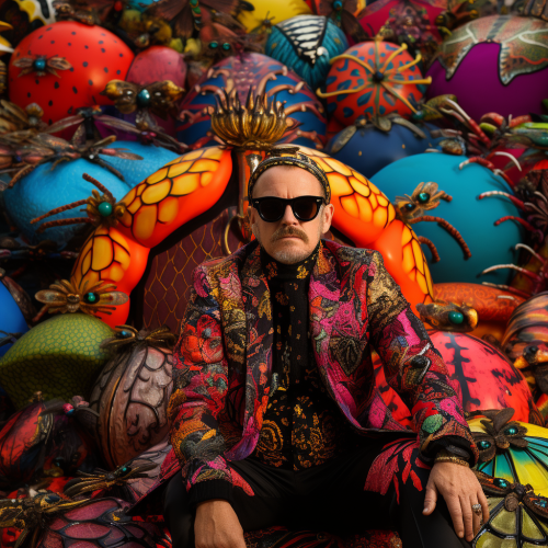 Authorof the Antasy series, Clark Thomas Carlton, wearing psychedelic clothing and standing among gigantic colorful ants <@1068372278565413047>