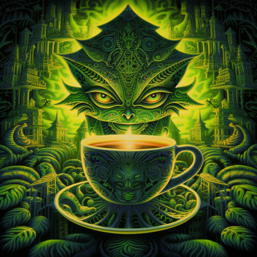 llustration of cute coffee maker, in the style of intricate psychedelic landscapes, tropical symbolism, chicano art, rim light, illustration, multicolored landscapes, poured --s 750