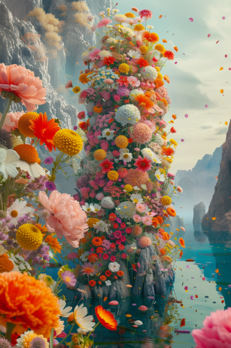 an art made of numerous colorful flowers in a tall, tall mountain, in the style of rendered in cinema4d, candycore, intricate underwater worlds, clemens ascher, bold color blobs, peter lippmann, close-up, colorful and colorful floral objects have grown up, in a watery setting, in the style of rendered in cinema4d, ethereal cloudscapes, made of flowers, mushroomcore, dusty piles, vibrant compositions, close-up, an artist does a project based on confetti, in the style of psychadelic surrealism, rendered in cinema4d, made of flowers, soft, dreamy landscapes, cellular formations, erik jones, ultrafine detail, flowers and mushrooms are arranged in a small area, in the style of rendered in cinema4d, intricate psychedelic landscapes, confetti-like dots, soft sculptures, ethereal cloudscapes, fluid photography, carnivalesque, 8k, ray tracing --ar 2:3 --v 6.0