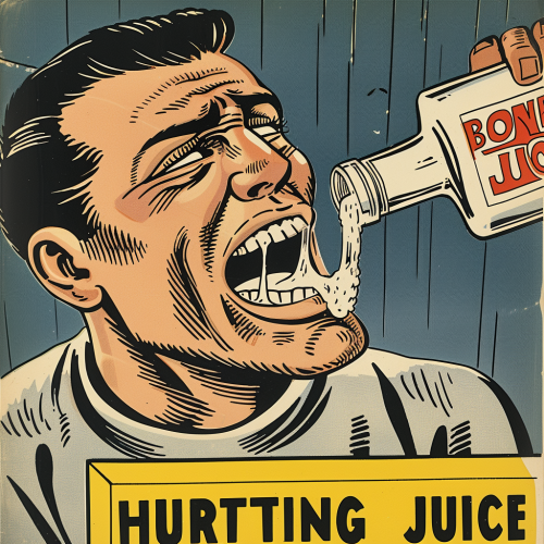 1940's comic book style advertisment, a man with pained expression, an oversized lower jaw and huge exaggerated underbite pours white powder into his mouth from a box labeled "BONE HURTING JUICE" --v 6.0 --style raw --s 50