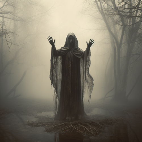 a creepy hooded figure standing in a misty void, one hand outstretched