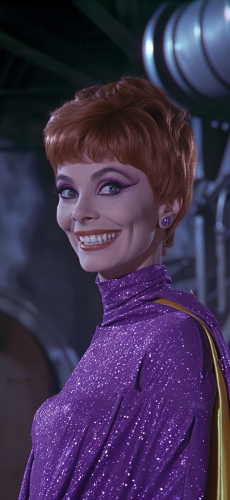close-up of Deborah Messing as Joker in lower third of the image, 1966 TV series, tight sparkle purple costume amazing hot fit body, matching tight sparkle purple suit and scarred smile , yellow-lined sparkle purple billowing cape in her secret hideout, in 1966 TV series, highly detailed beautiful face, highly saturated colors, intense colrful side lighting, dramatic cinematic lighting, psychedelic set design, saturated colored lights --ar 375:812 --v 6.0
