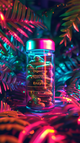 Supplement container that says "Digestive Enzymes" on it, in nature, sunlight, vibrant colors, vivid, detailed, realistic, slightly psychadelic aesthetic --ar 9:16 --v 6.0