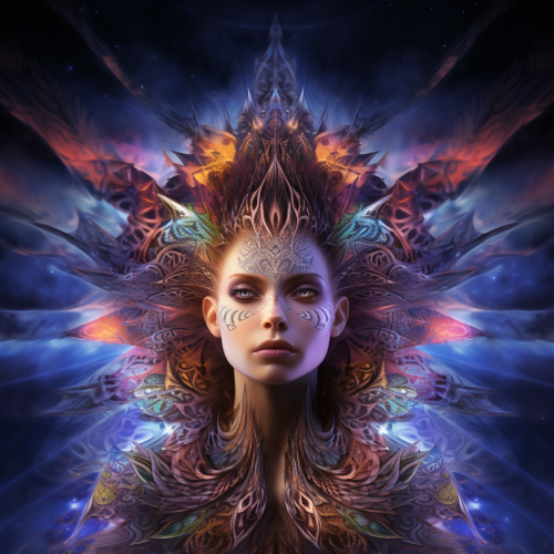 priest magician of the cosmic temples, sparkles, halo, solfeggio tones, 528 hz, golden ratio, sacred geometry, colors in harmony: pale blue, white, violet, image that evokes the transcendence and illumination of consciences, guru, shaman , peyote --ar 2:3 --v 6.0