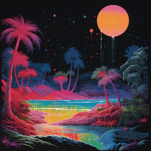 risograph of a beautiful galctic neon tropical jungle with disco balls, pink floyd dark side of the moon in the style of Jean Giraud Moebius, fluorescent blacklight colors