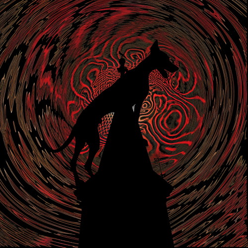 Sihouette of a giant doberman on a steeple, scary, creepy, dead eyes, black swirls, trippy, psychedelic, album cover art --s 50 --v 6.0 --style raw
