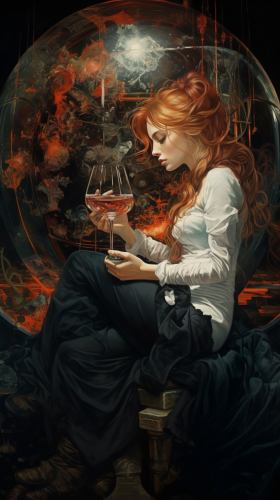 half of the girl is in meditation, the other half is crazy with a glass in her hand --ar 9:16