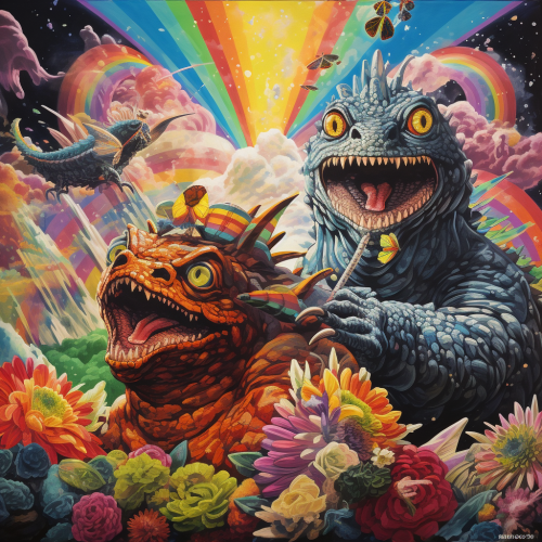 happy godzilla and mothra hanging out and being friends in a psychedelic wonderland