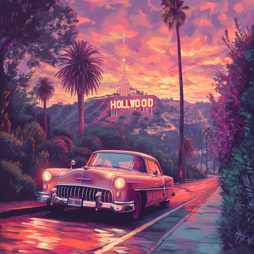 beautiful scene of Hollywood, illustrated, "HOLLYWOOD" sign is prominent in background, psychedelic style --stylize 250 --v 6.0