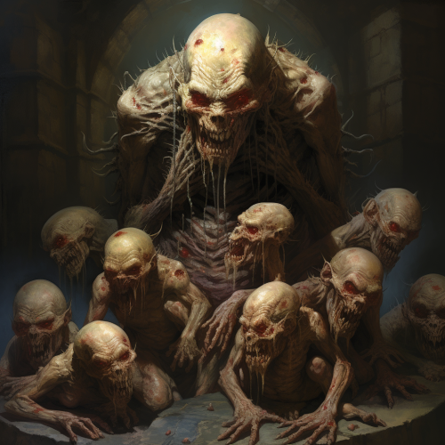horrifying monster, Crawling King disciple, wears its victims heads and talks through them