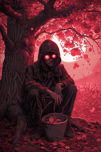 Jamie Diamon with an emoji happy head with bitcoin eyes holding a bucket of bitcoins while sitting under a tree, in the style of dark maroon and light red, psychedelic overload, made of all of the above, eerily realistic, i can't believe how beautiful this is, metalcore, stimwave --ar 2:3 --v 6.0
