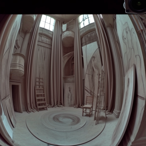 fashion show in inflated 3D psychedelic rococo installation in old palace, model wears yohji yamamoto clothes --v 6.0