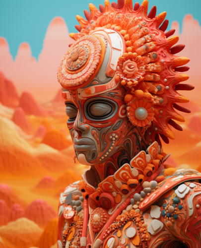 this is a close up of a man with a totem in his suit, in the style of intricate psychedelic landscapes, rendered in cinema4d, elaborate costumes, petrina hicks, cowboy imagery, made of crystals, terracotta --ar 13:16