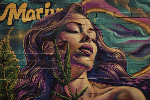 "Marijuana" a Poster, title, cursive, strong spelling, wieght .40 Marijuana, an image of a supermodel woman standing by and in front of a mural, in the style of marijuana, kush cannabis, smoke, bones, skeletal, goerz hypergon 6.5mm f/8, colorful cubist, etam cru, mitch griffiths, roa green and purple colors theme --ar 128:85 --v 6.0