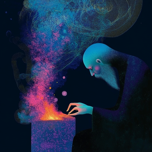 A mage is whispering leaning over the flame, he conjures up a visible spirit in the smoke, primordial spirit, blue and purple with magenta accents --style raw --sref 1187806033 809625481 824935293 3322162017 --personalize 4a59zhx --v 6.1
