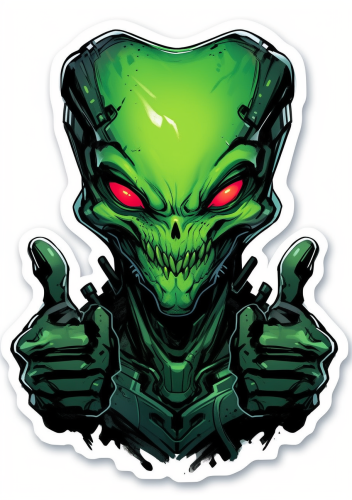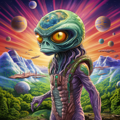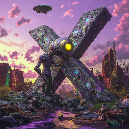 grey alien with yellow eyes building a giant 3 dimensional letter X, purple theme, UFO in background, psychedelic sky and clouds with river, in style of acid trip psychedelic dream art, clean, professional graphic designer