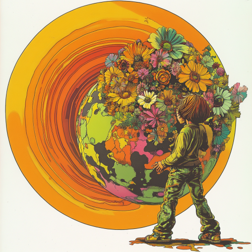 A retro 70s flower child with large, exaggerated flowers growing from their hair and hands, standing against a giant wrecking ball covered in a corporate logo. The scene features psychedelic, swirly backgrounds of bold oranges, yellows, and greens, with a playful but serious tone, white background