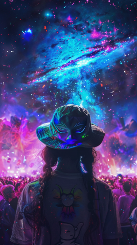colorful raver girl wearing anonymous mask and bucket hat with third eye standing at the back of the festival crowd. the universe above them. in the style of artist vexx --v 6.0 --ar 9:16