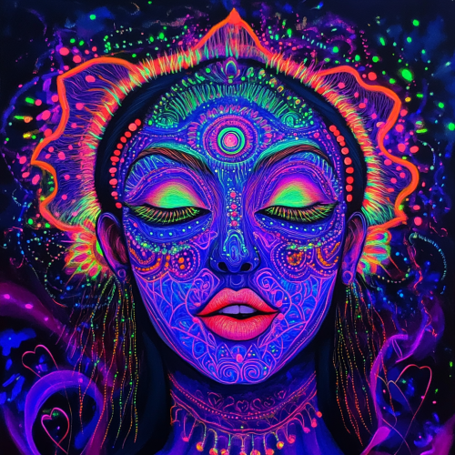 Medium: colorful painting, bold lines. Subject: goddess on acid trip. Emotion: transcending. Lighting: Soft. Scene: Psychedelic mandala. Style: Android Jones painting, inferred photography.
