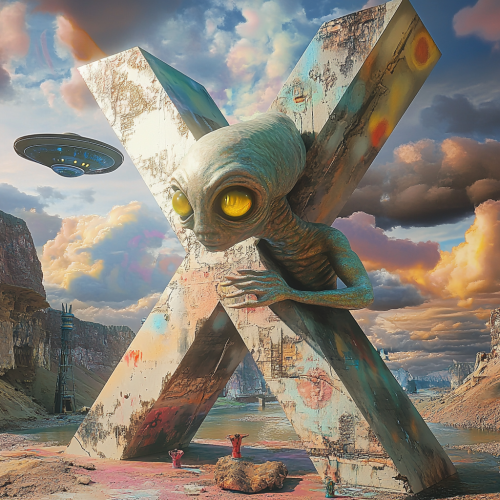 psychedelic acid art grey alien with yellow eyes building a giant 3 dimensional letter X, with UFO in background, psychedelic sky and clouds with river