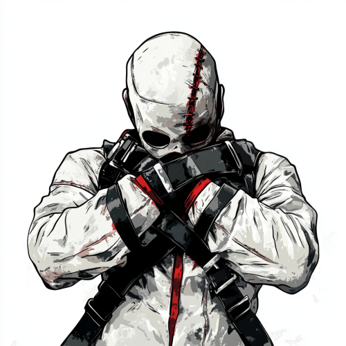create an illustration done in the style of a college mascot logo. The illustration is of a man wearing a White Straight jacket with black leather straps and buckles holding in his arms tightly. the man is erratic and expressive isolated in white background, high detail. Illustration done with adobe ilustrator. style expressive using colors black grey and red