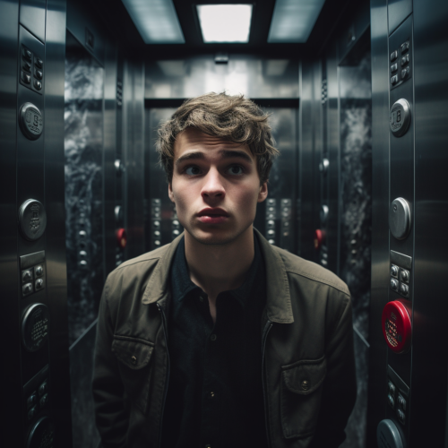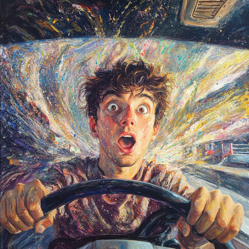 young man with brown hair, eyes crazy and wide, very very inebriated on psychadelic drugs, driving his car through an active busy construction site, totally out of control