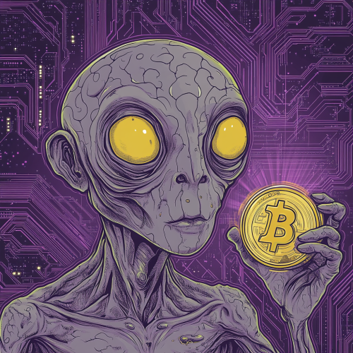 grey alien with yellow almond-shaped eyes holding a levitating gold coin with an X , purple theme, microchip pattern, psychedelic in style of matt furie