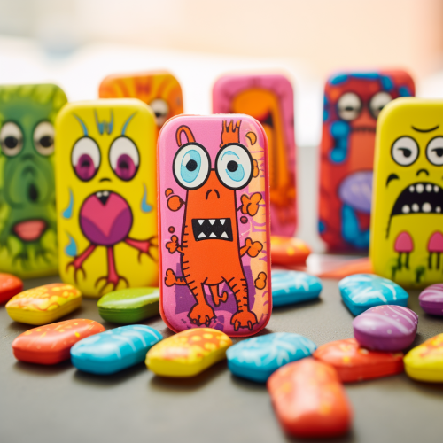 Collage mural of cartoon monsters, new school tattoo, ink drawing, vibrant colours