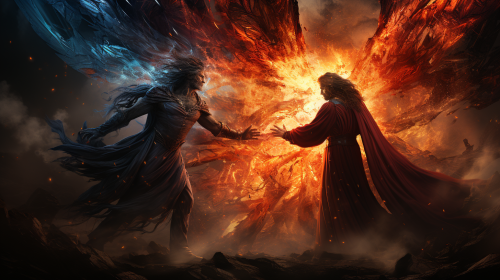 angel michael fighting lucifer, deep colors, vibrant . metatrons cube center, photorealistic nikon lens wormseye view, --stylize 1000 --ar 16:9